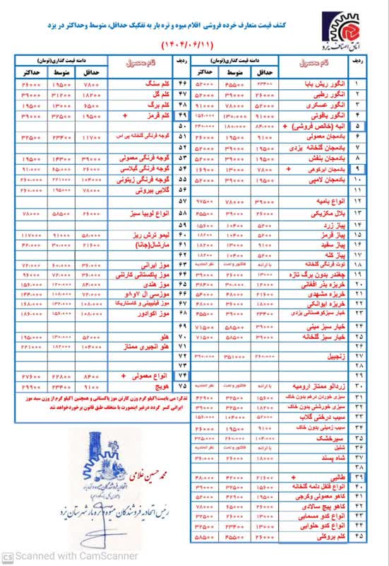 لیست قیمت 12 شهریور میدان تره بار یزد به شرح زیر است:
